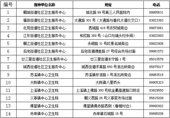 2020年9月底至10月25日,我市14家镇街中心卫生院(社区卫生服务中心)预防接种门诊将按预约情况开展接种。