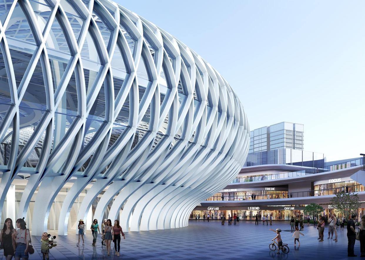 作为核心视觉焦点,有“小巨蛋”之称的“数贸港”堪称技术与美学交融之作。其采用悬浮式扁球体造型,底层内凹架空,形似灵动睿智的“数字大脑”,极具辨识度。Y形分叉柱与米字型交叉网格幕墙,构筑出仿若神经元链路的立面肌理,成为全球数贸中心数字化、智能化内核的物理象征。