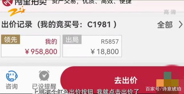 他交了5万8千元的保证金,早早准备好手机,到点之后立即点击红色出价按钮出价,出价成功后,显示的价格是¥958800,而不是自己预想的¥18800,周先生愣住了!明明出的是¥18800怎么会变成¥958800呢?