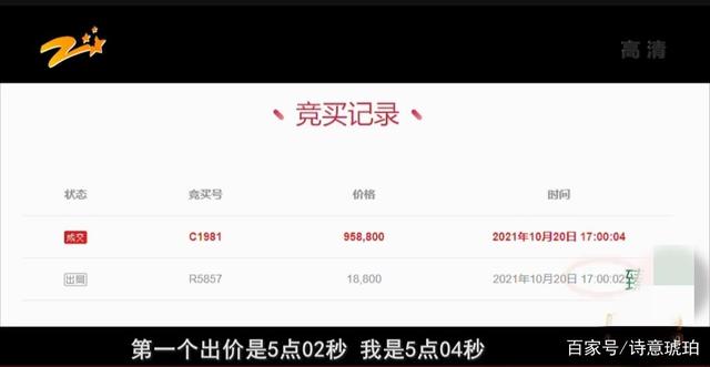 周先生赶紧联系拍卖公司,拍卖公司告诉他他是第二个出价的,第一个出价时间是5点零2秒,他出价时间是5点零4秒,他们的加价规则是一次加价94万,所以周先生实际出价是¥958800。