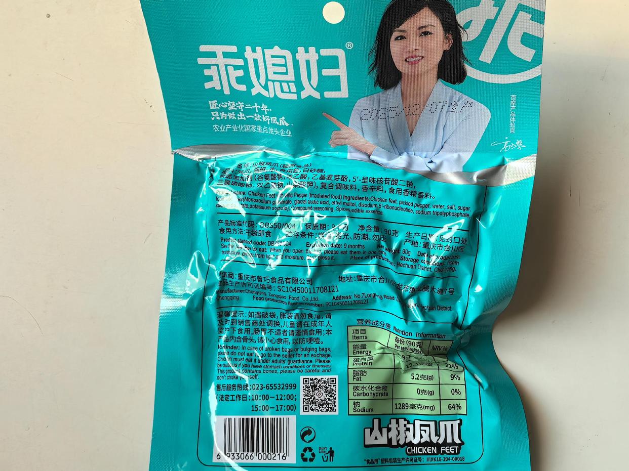 记者随即在熊本便利店(天通苑店)购买到了两款产品:一款为20g/袋的乖媳妇山椒凤爪,售价为1.5元;另一款为90g/袋的乖媳妇山椒凤爪,售价为6.5元。产品包装信息显示,这两款产品的制造商均为重庆市曾巧食品有限公司,正是此次“315”晚会点名的涉事企业之一。产品包装上写着,“匠心坚守二十年,只为做出一款好凤爪”“农业产业化国家重点龙头企业”。
