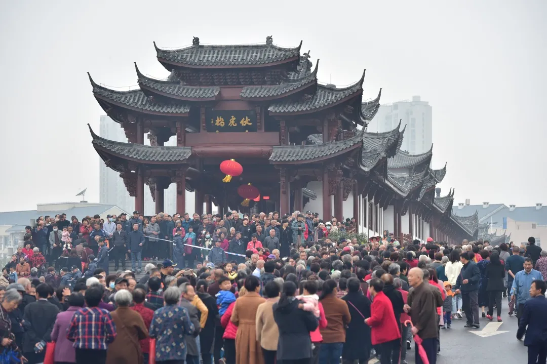 伏虎桥古建廊桥总长204.8米,通过设计行人休息区、搭配绿化等设施实现人车分流。